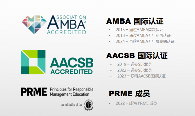 学院积极拓展对外交流与合作,与欧美、亚洲等境外30多所大学及国内知名高校建立了合作关系,共同培养国际化人才,每年国际互访的学者超过50人次,开设由海外师资讲授的国际化课程近20门。2015年获得AMBA国际商学院认证,2018年通过AMBA再认证,获五年最高认证期限。2022年正式成为联合国责任管理教育原则(PRME)的签署成员。2023年7月学院正式通过AACSB国际认证,认证期限为5年。2024年9月,学院再获AMBA五年最高期认证。