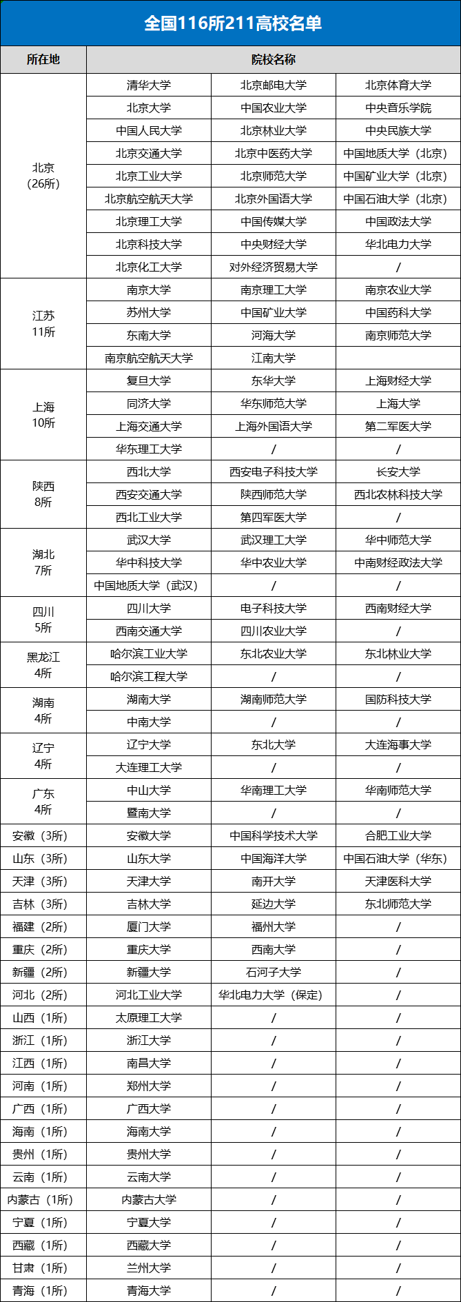 共有学校112所,后共有116所高校。2019年11月28日,教育部官网发布声明:已将“211工程”和“985工程”等重点建设项目统筹为“双一流”建设。