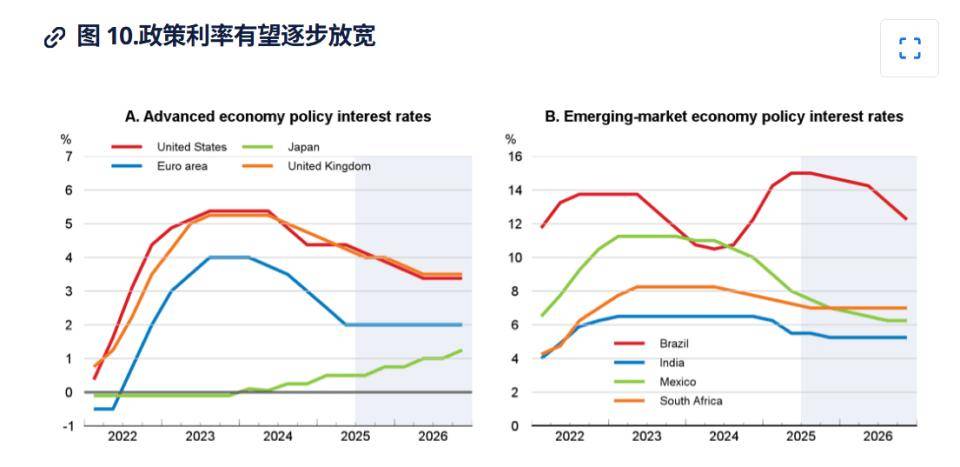 报告建议继续降息。近期多家主要央行下调政策利率。在发达经济体中,美国和加拿大均在9月份下调了政策利率,对劳动力市场下行风险的担忧超过了关税上调带来的上行通胀压力的风险。相比之下,日本自1月以来的政策利率保持不变,欧元区自6月以来一直保持不变。由于通胀压力得到控制、近期货币兑美元升值以及美国贸易成本上升和不确定性增加带来的不利需求冲击,许多主要新兴市场经济体的政策利率均有所降低。许多国家的央行缩表也在继续,但包括美国和英国在内的一些国家的缩表速度有所放缓。