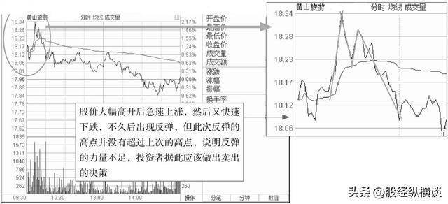 黄山旅游出现高开倒W形走势后,出现阶段性顶部,在K线图中形成尖顶形态,如图2-2所示,它是最常见的顶部反转形态,一般出现在上升趋势的末期,是行情上涨到顶点后的反转信号。投资者只要看到股价反弹时受到均价线压制,而没有超过前期高点,即可果断卖出股票。
