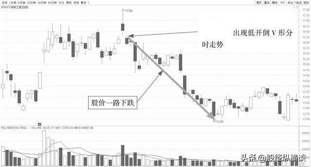 钢构工程在下跌途中出现低开倒V形走势后,预示着后市继续看跌,投资者应尽快离场,结合其K线所示。