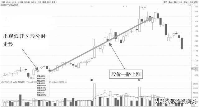 (1)高开N形走势:高开N形走势是指股价在高开后,迅速上冲,不久又快速回落,接着再次快速上冲,突破第一次高开的高点,在整个分时图上呈现字母“N”的走势。