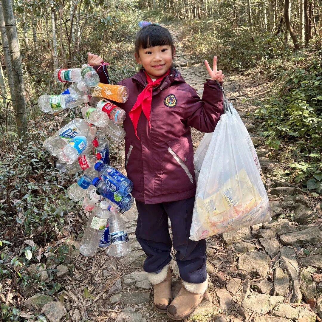 来自杭州市凤凰小学的刘语泽来到午潮山,像寻找宝藏一样认真搜寻着草丛、路边的垃圾,践行少先队员的责任。