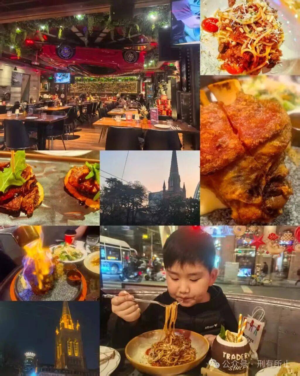 晚上,我们在外滩1886德国汽车餐厅吃西餐。这家餐厅最大的招牌,是天花板上倒挂着一辆红色的法拉利汽车(非模型),还会像钟摆一样旋转,能配合外滩钟声报时,一进门就能看到。主打德式风味,“大块吃肉、大口喝酒”。必点菜是火焰猪肘,上桌时会点火炙烧,视觉和食欲瞬间被拉满,还有香肠拼盘、鹅肝等特色菜品,精制自酿啤酒(黄啤、白啤、黑啤都有)68元一杯,买一送一。有乐队和歌手现场驻唱,灯光变幻,酒吧氛围很浓。