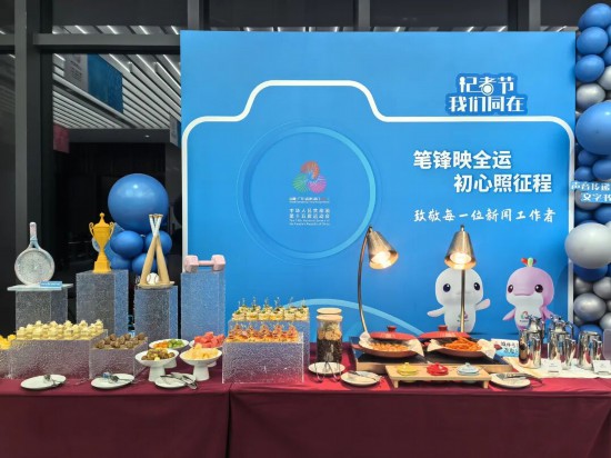 当天上午,刚完成首波赛事素材整理的来自山东的媒体记者,在“庆祝空间”品尝着定制茶点时难掩惊喜:“跑赛事这么多年,还是第一次在媒体中心收到记者节的专属祝福。你看这布置,背景板上还写着‘笔锋映全运,初心照征程’致敬每一位新闻工作者,顿时感觉自己的工作被认可、被支持,非常暖心。还吃到了有广东特色的荔枝酥、蛋挞,细节里全是心意,非常感谢深圳赛区。”